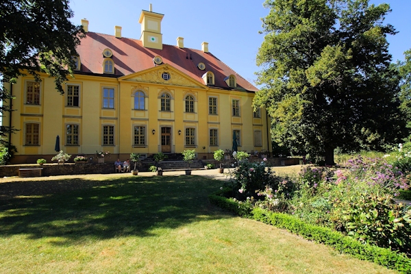 Betritt man das Schloss durch das hofseitige Portal, gelang man zunächst in eine geräumige Vorhalle. Links schließt sich ein Vestibül mit Treppenhaus an. Geradeaus öffnet sich der Weg zum Stein- oder Gartensaal. Von ihm führen einige Stufen hinunter auf das einst im französischen Stil gestaltete Gartenparterre. Vasen und Sandsteinfiguren der vier Jahreszeiten belebten früher den Park.