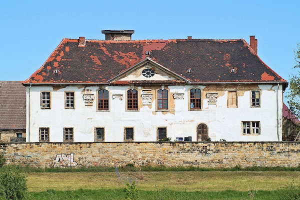 Zur Rittergutsanlage gehörten neben dem Schloss auch ein Gutsverwalterhaus, Wirtschaftsgebäude und Scheunen. Ein Schlussstein am rundbogigen Hoftor, bezeichnet mit "C.G.v.T / 1746", weist Carl Gottlieb von Thielau als Erbauer aus. Ein weiterer Schlussstein am Stallgebäude, bezeichnet mit "Anno 1747", gibt dessen Baujahr preis.