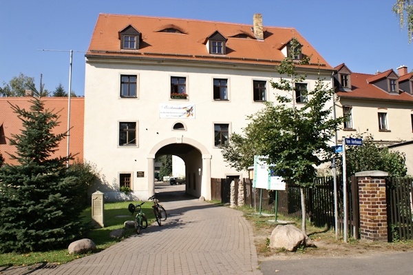 Von den Wirtschaftsgebäuden des Rittergutes sind jedoch nur noch zwei auf der Ostseite in historischer Form erhalten geblieben. Sie sind seitlich an das Torhaus angebaut. Das zweigeschossige verputzte Torhaus hat bis heute seine Gestalt aus dem Jahre 1664 bewahrt. Es bildete in früherer Zeit den einzigen geschützten Zugang zur Wasserburg und war mit einer Zugbrücke über den Wassergraben versehen. Im Jahr 1664 erfolgte eine Neugestaltung des Torhauses mit teilweise profilierten Fenstergewänden aus Rochlitzer Porphyr und zwei Sitznischenportalen mit Beschlagwerk auf der Hofseite. Im Schlussstein des linken Portals ist die Jahreszahl 1664 vermerkt, dazu die Monogramme SFVF und ACVFGA, die für Statz Friedrich von Fullen und seine Ehefrau Anna Catharina von Fullen geborene Anckelmann stehen. Im rechten Sitznischenportal bezieht sich die Buchstabenfolge A.C.M.G.A. auf Anna Catharina Metzner geborene Anckelmann. Die Gutserbin hatte in erster Ehe den Leipziger Bürgermeister Jacob Metzner geheiratet, der jedoch 1656 verstorben war. In der Durchfahrt mit Flachbogen befindet sich noch eine Grabplatte des Christof von Schönfeld.